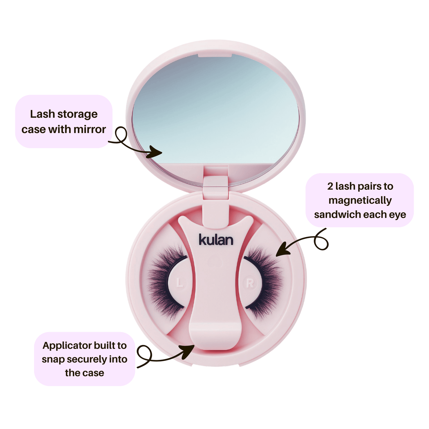 You'll get the complete Kulan magnetic lash package: A stylish lash mirror storage case, a complete set of lashes with two magnetic pieces for each eye (four pieces total), and a lash applicator that conveniently fits into its designated slot.